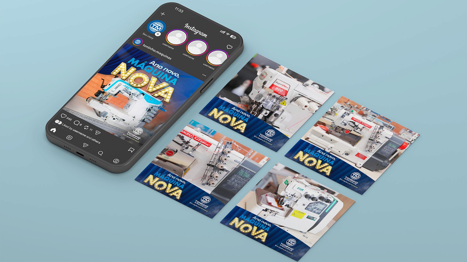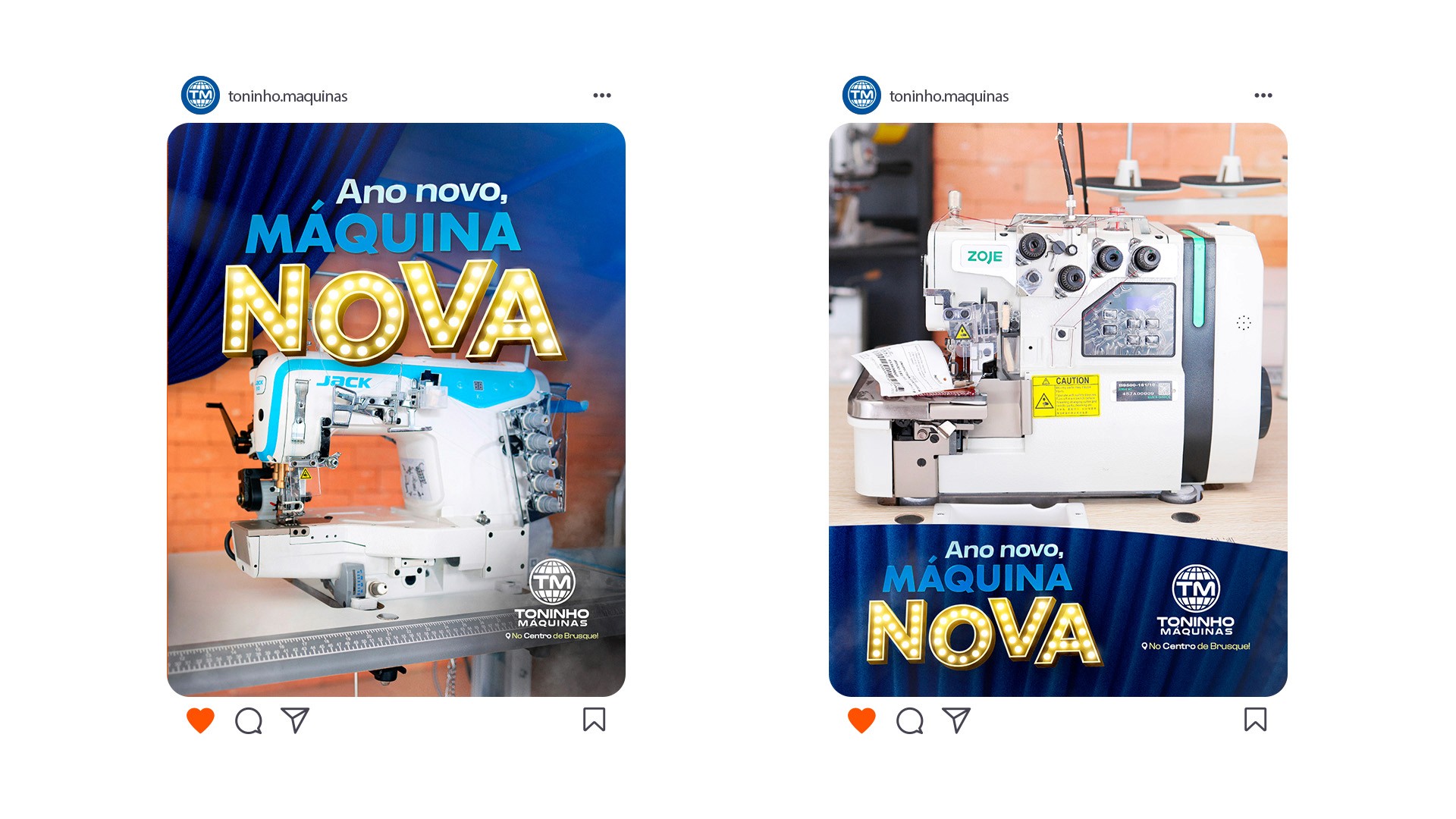 Ano virou e a Toninho Máquinas virou a vitrine junto. Criamos a campanha Ano novo, máquina nova para anunciar as novidades com energia, visual forte e uma mensagem bem direta: tem equipamento novo para quem quer produzir mais e melhor.