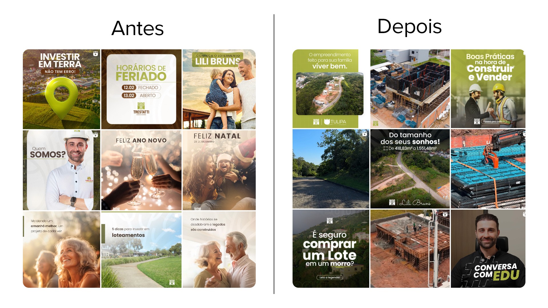 Agora, com a nova Linha Editorial desenvolvida para a empresa, unimos estratégia e clareza para criar um conteúdo mais assertivo. Mesclamos postagens focadas em vendas — destacando os loteamentos da urbanizadora — com conteúdos informativos que esclarecem dúvidas e orientam os possíveis compradores, tornando a marca de fato, humanizada!