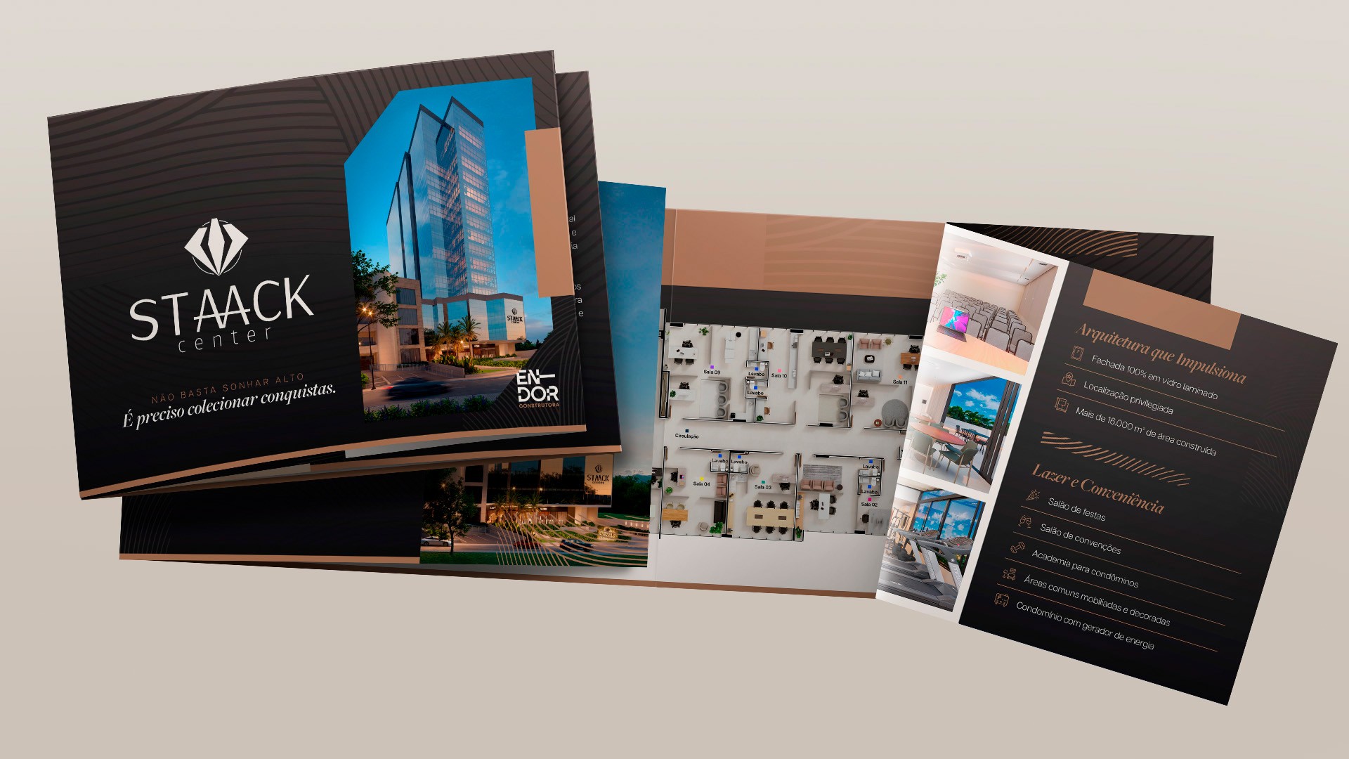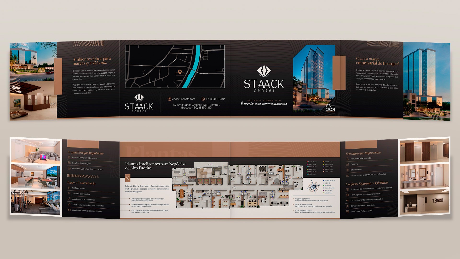 Para o Staack Center, da En-Dor, desenvolvemos um folder elegante e direto, com mensagem rápida, visual forte e informações no ponto certo, para apoiar o comercial e apresentar salas corporativas de alto padrão em Brusque com confiança.